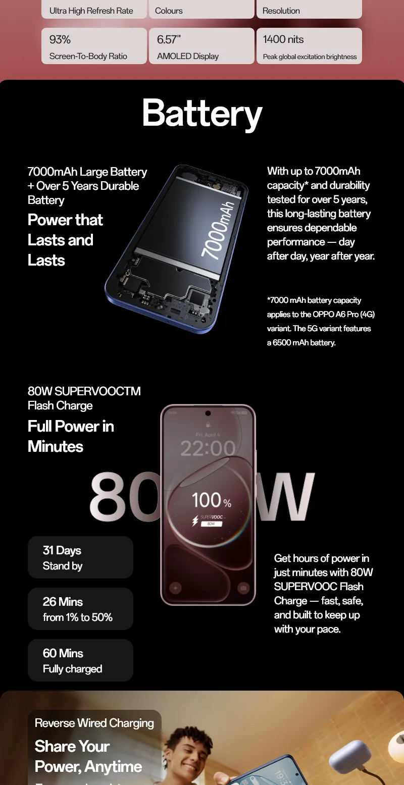 ● 6500/7000mAh Battery + 80W SUPERVOOC Flash Charge