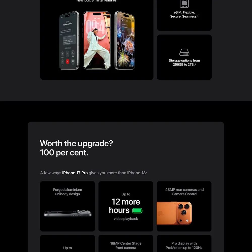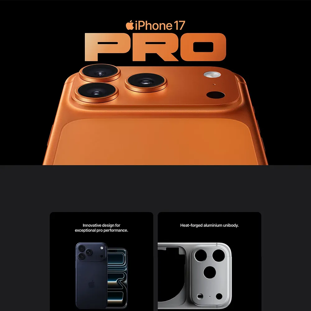Design & Durability: The iPhone 17 Pro features a heat-forged aluminum unibody design. The rear camera system has been redesigned into a horizontal "camera plateau" across the back. It has an IP68 rating for water and dust resistance.